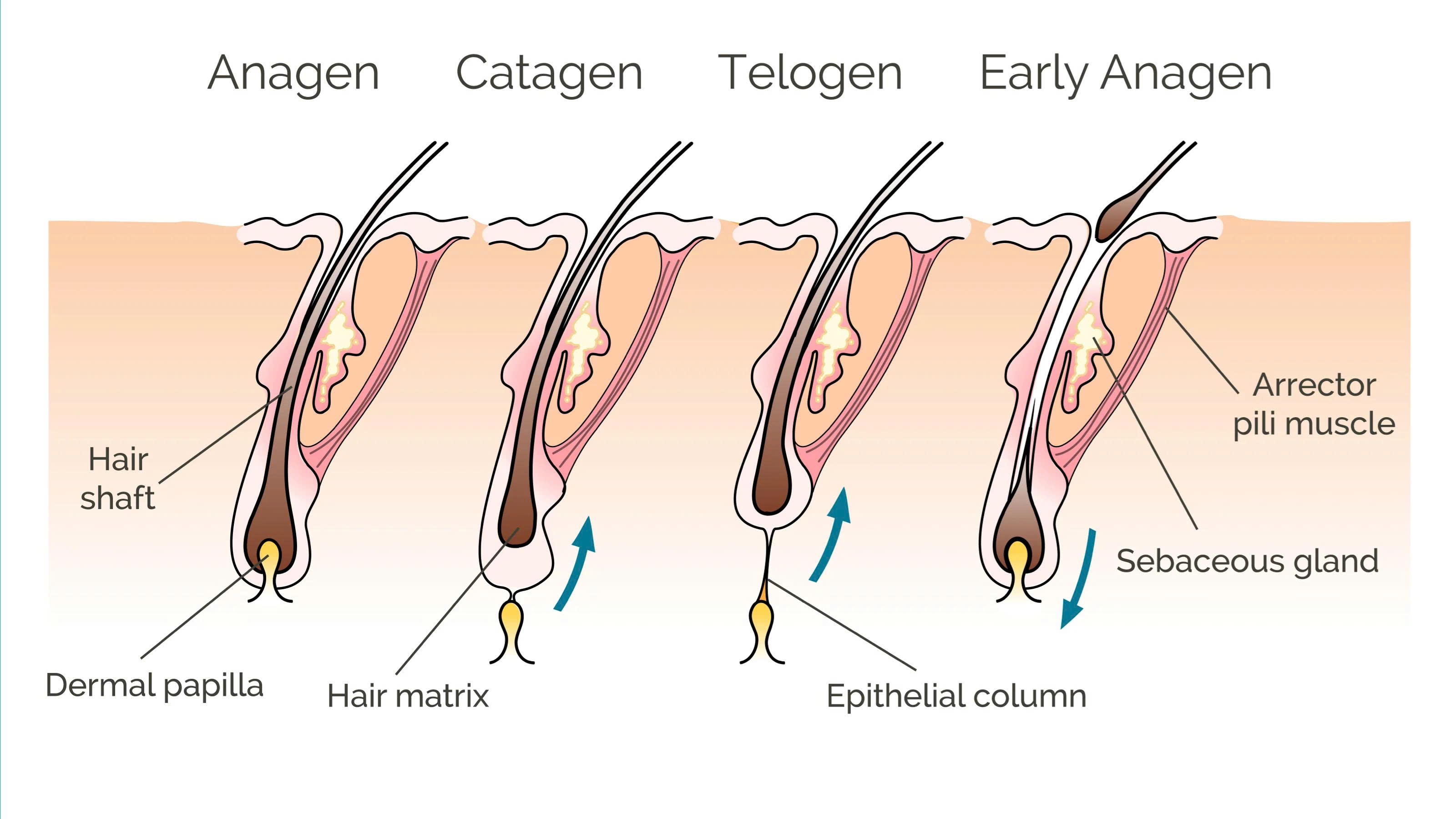 Exogen (Giai đoạn rụng): Sợi tóc cũ rụng đi để nhường chỗ cho sợi tóc mới (Early Anagen) nhú lên.